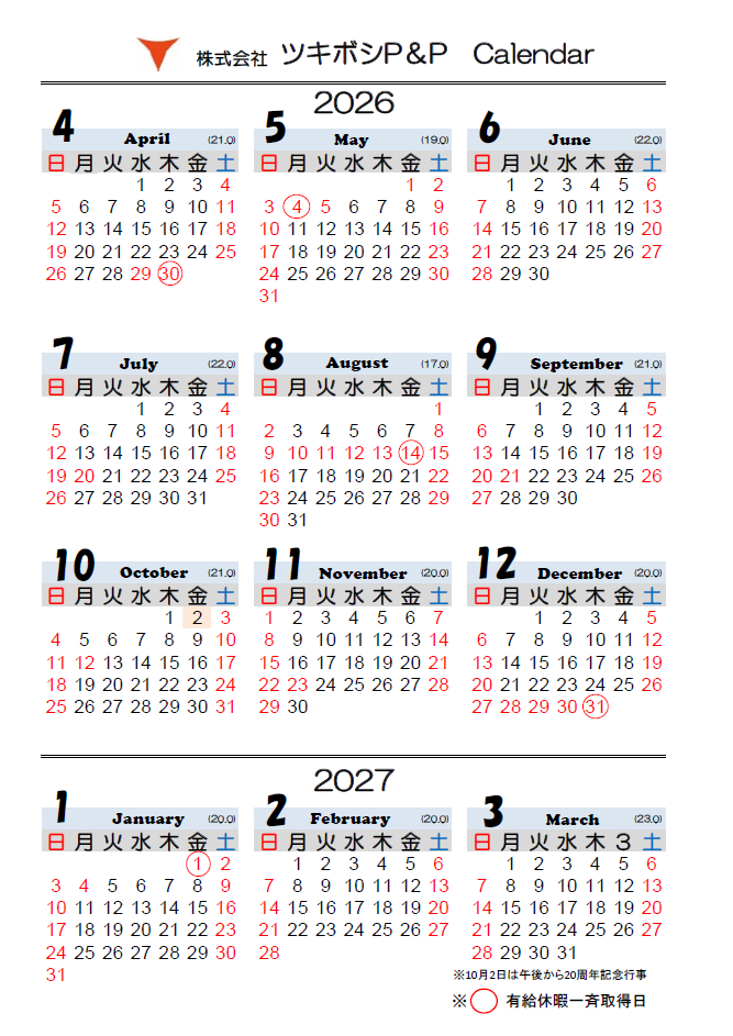 2026.02.13 2026年度版会社カレンダーを公開します 2026年度(2026年4月1日~2027年3月31日)のツキボシP&P会社カレンダーをお知らせいたします。 会社カレンダー(2026年度) 一覧へ